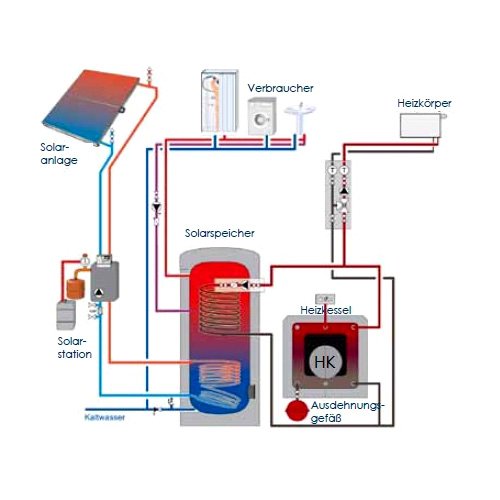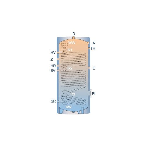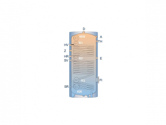 Tūrinis vandens šildytuvas su dviem gyvatukais, skirtas karštam vandeniui ruošti panaudojant saulės kolektorius, elektrinį teną ir papildomą šilumos šaltinį - pvz. kieto kuro ar dujinį katilą.