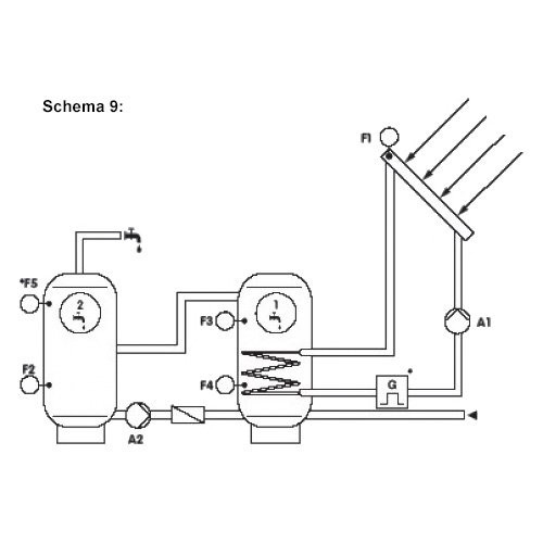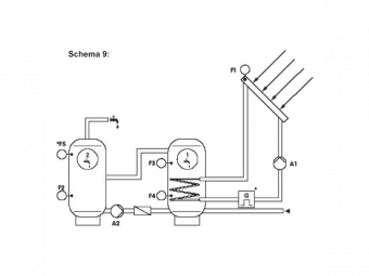 Schema 9: Saulės sistema su dviem tūriniais šildytuvais, keičiamais kaskadiniu būdu