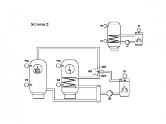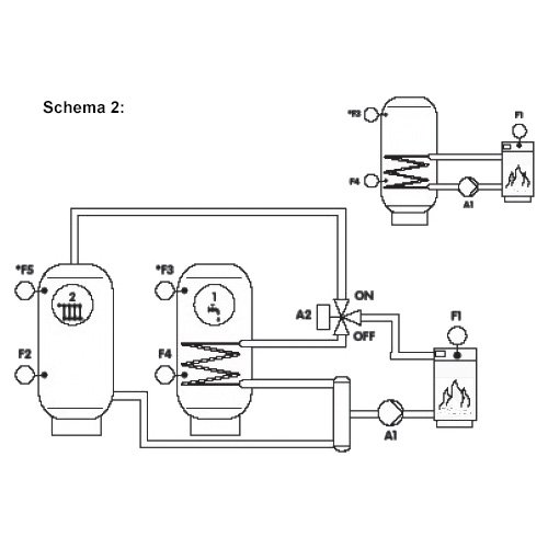 Schema 2: Kieto kuro katilas su dviem tūriniais vandens šildytuvais