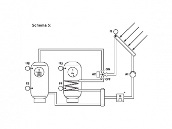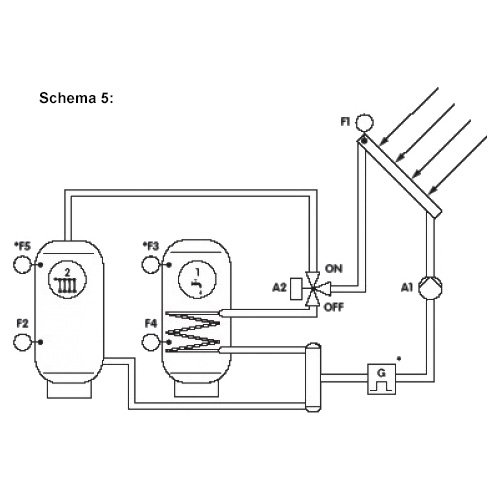 Schema 5: Saulės sistema su dviem tūriniais šildytuvais, perjungiamais vožtuvo pagalba