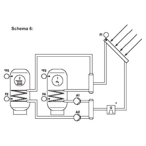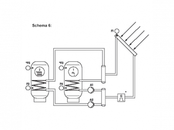 Schema 6: Saulės sistema su dviem tūriniais šildytuvais, kraunamais atskirais siurbliais