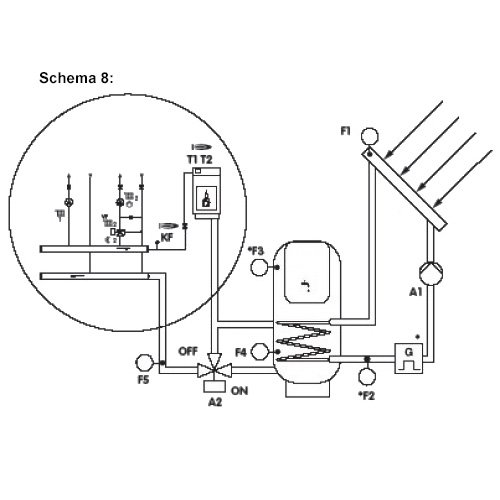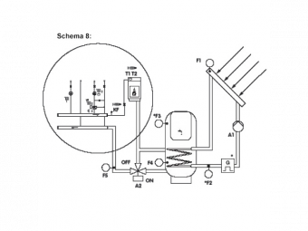 Schema 8: Saulės sistema su šildymo sistemos grįžtamo srauto temperatūros pakėlimu